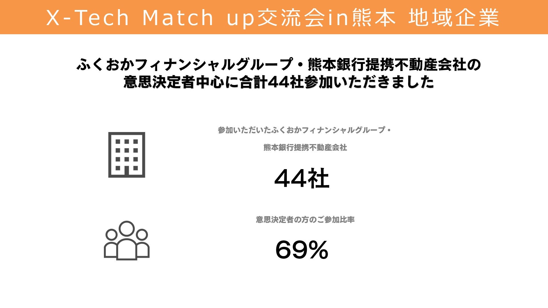 株式会社ふくおかフィナンシャルグループ(取締役社長 五島 久、以下「ふくおかフィナンシャルグループ」) 傘下の株式会社FFGベンチャービジネスパートナーズ(代表取締役社⻑ 吉田 泰彦、以下「FVP」)は、株式会社熊本銀行主催『FFG・熊本銀行提携不動産会社交流会』と共同開催にて、スタートアップと地域企業のネットワーキングイベント『 X-Tech Match up(クロステックマッチアップ) 交流会 in熊本』実施いたしました。