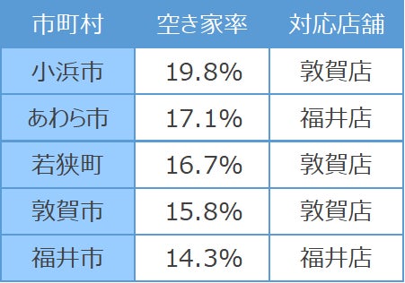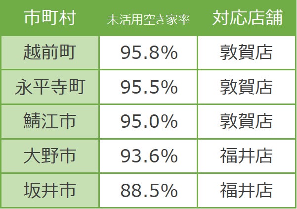 今回開設した新店舗は、空き家率が最も高い小浜市をはじめとし、若狭町や敦賀市も管轄します。さらに、活用用途が決まっていない“未活用空き家(その他空き家)”の率が最も高い越前町や、永平寺町・鯖江市も管轄します。*²