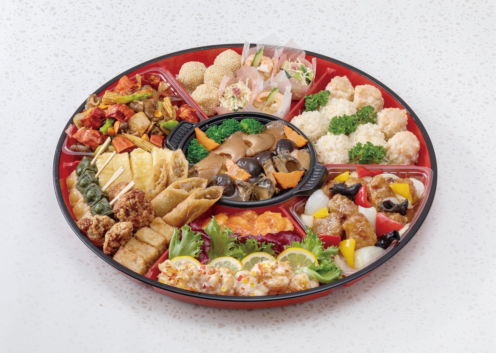 フカヒレと鮑の煮込み・生麩田楽・湯葉揚げ・唐揚げ・春巻き・大根餅・とうふしゅうまい・えびづつみ・胡麻団子・くらげ酢・押し豆腐の和え物・牛ハラミと烏賊の麻辣醤炒め・海老のマヨネーズ和え・海老と生麩のチリソース煮・まきまき酢豚