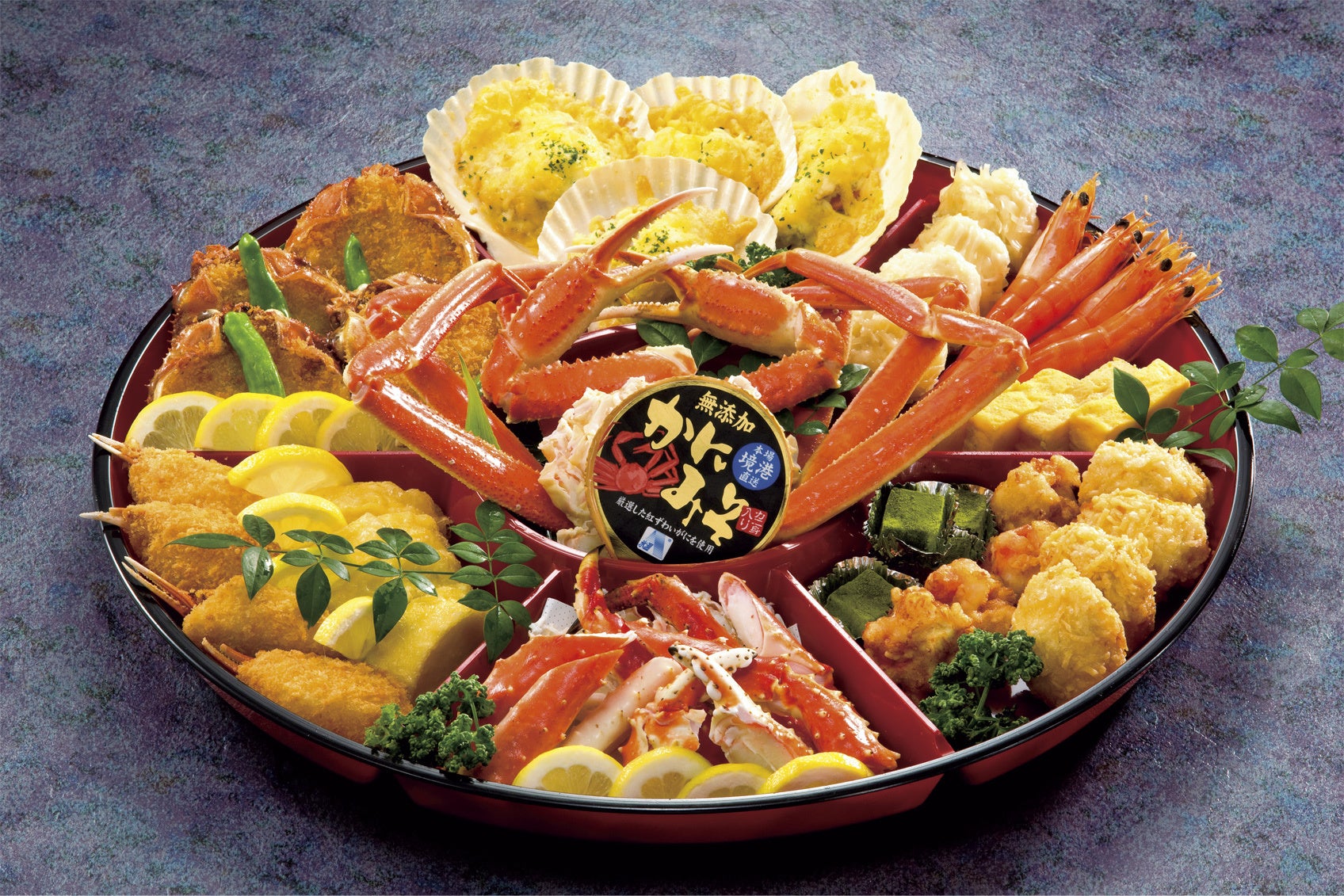 ずわいかに・たらばかに・かにみそ・かにしゅうまい・竹皮おこわ・麩まんじゅう・地鶏の唐揚げ・海老カツ・海鮮春巻き・かに甲羅揚げ・湯葉かにクリームコロッケ・湯葉揚げ・銀鱈の西京焼き・出汁巻き玉子・豆腐ハンバーグ