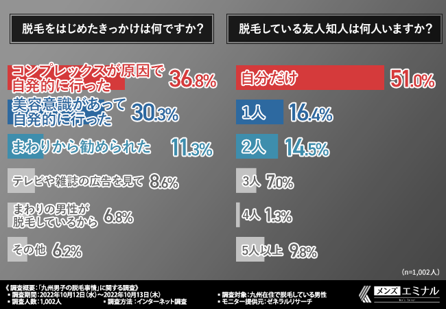 そこで今回、メンズ医療脱毛クリニック『メンズエミナル』(https://mens-eminal.jp/lp/?refmedia=31073)は、九州在住で脱毛している男性を対象に、「九州男子の脱毛事情」に関する調査を実施しました。