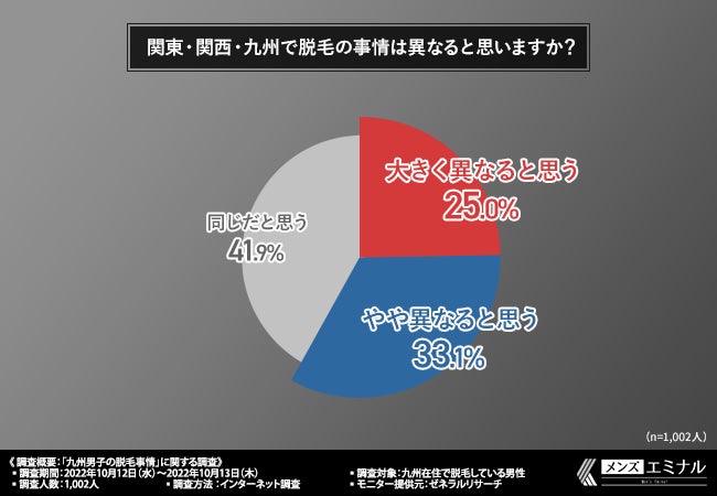 「関東・関西・九州で脱毛の事情は異なると思いますか?」と質問したところ、『大きく異なると思う(25.0%)』『やや異なると思う(33.1%)』『同じだと思う(41.9%)』という回答結果になりました。