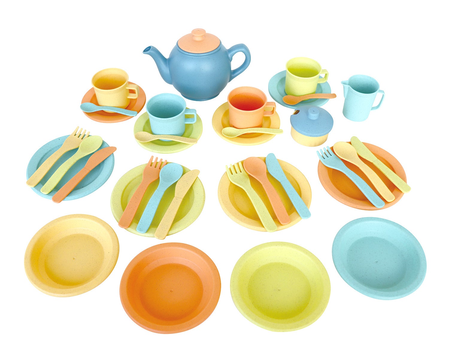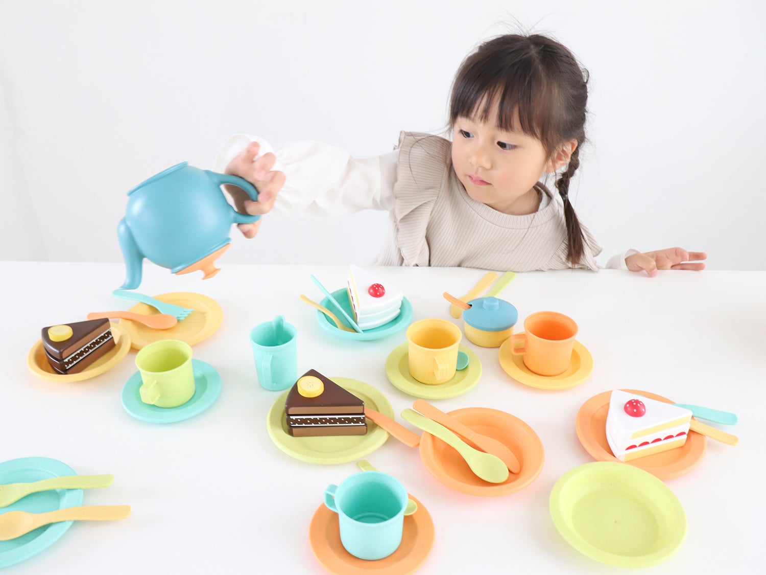 美味しいお茶が淹れられそうな、コロンとまあるいティーポットが特徴的。ティーカップ・カトラリーなど合計35点がセットになっています。スイーツ系のままごと食材とも相性が良く、華やかでSNS映えのするテーブルコーディネートが楽しめます。