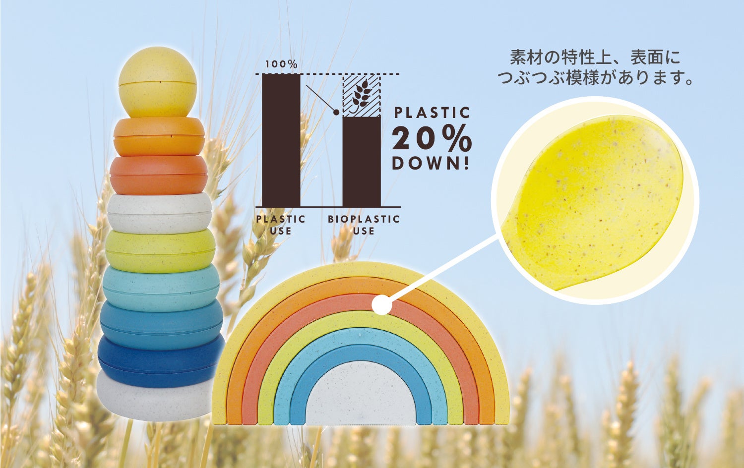 プラスチック素材の一部に「小麦の茎」を全体の20%配合することで、プラスチックの使用量を軽減しています。一般的な艶のあるプラスチック素材と異なり、おもちゃの表面に素材特有のつぶつぶ模様が見られ、ナチュラルな素材感を演出しています。手触りはマットでさらっとした質感。高級感があり、小さなキズも目立ちにくい仕様です。