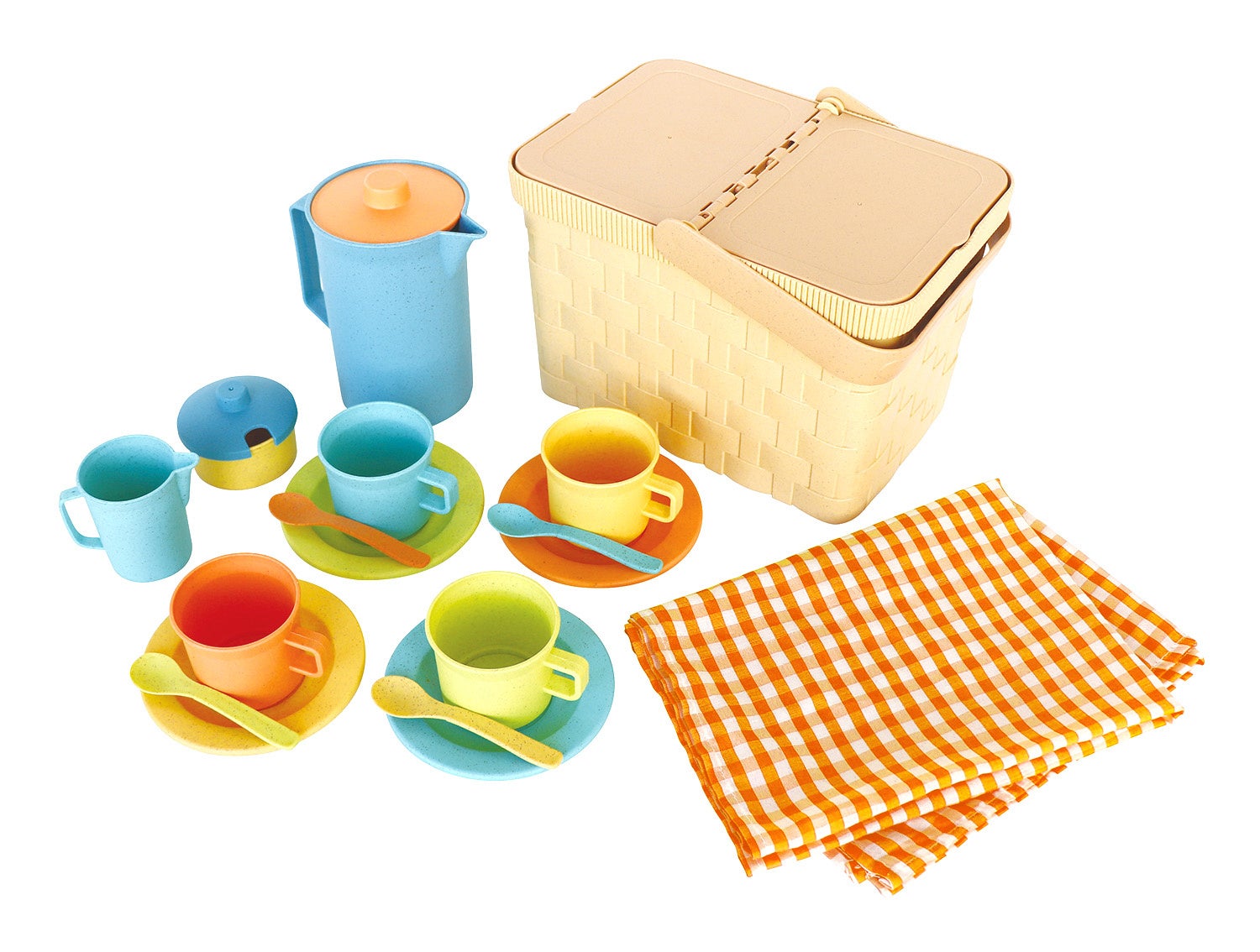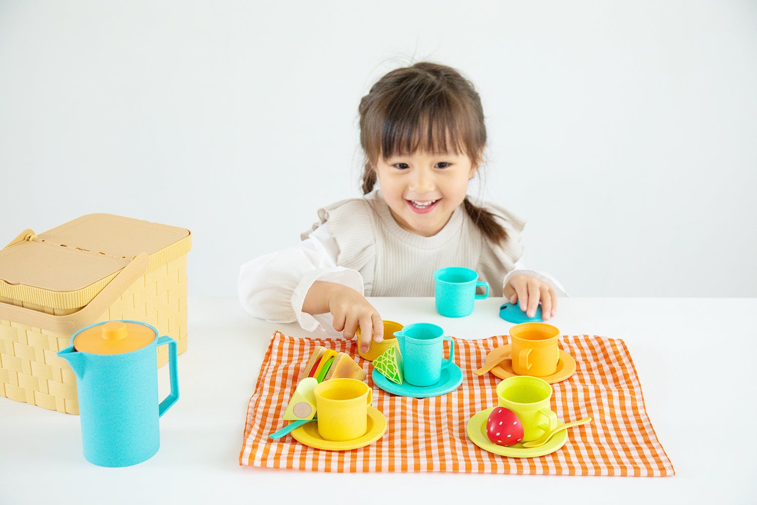 大きなバスケットに、ポットやティーカップ・カトラリーなど合計17点がセットになっています。チェックのクロスで、ピクニックごっこの気分も味わえます。遊んだ後はバスケットに全て収まるので、お片付けの練習にもなります。