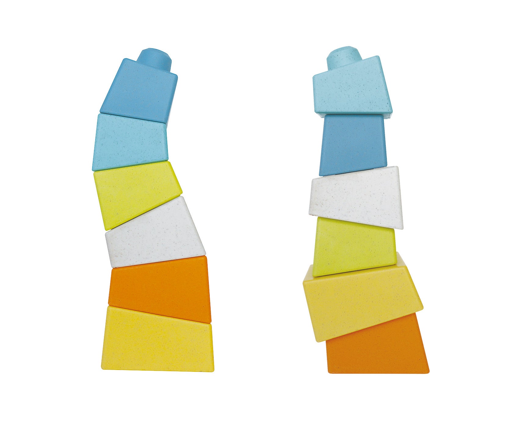 ブロックの凹凸にあわせて積み上げていくスタッキングトイ。角度のついたブロックは、積み上げる向きによって形の変化も楽しめ、造形力も育めます。