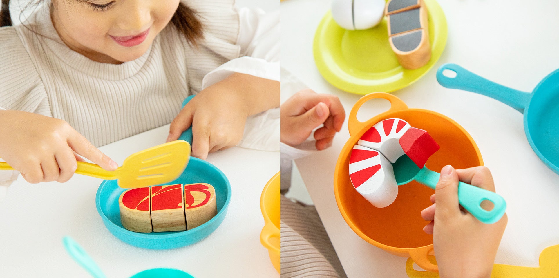 調理器具やカトラリーを中心に、きょうだいやお友達とも一緒に遊べるボリュームを備えたままごとセット。手持ちのままごと食材と組み合わせて、みんなで楽しく遊びながら想像力やコミュニケーション能力を育みます。