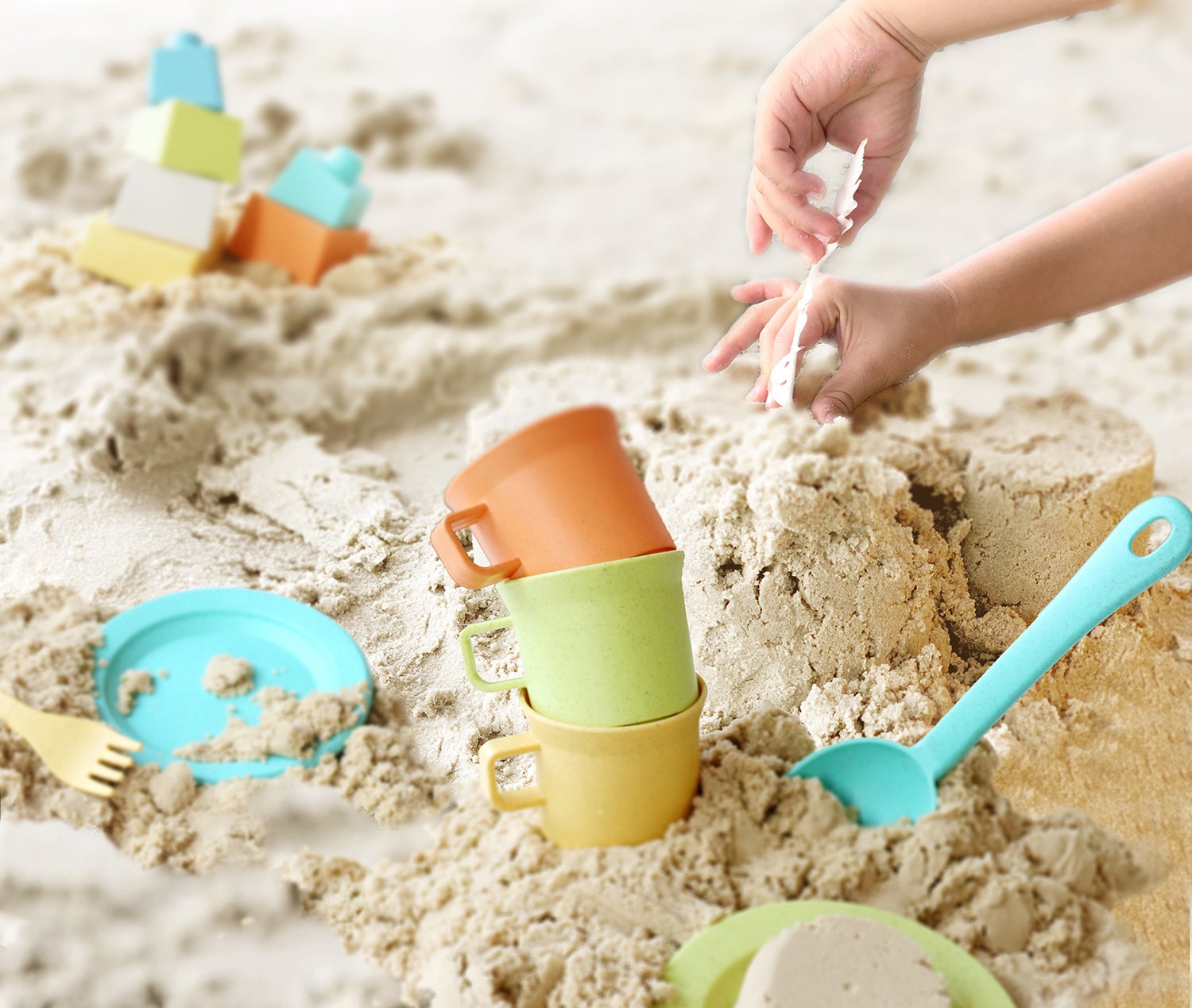 ecomugiシリーズのおもちゃは、軽くてお手入れも簡単なプラスチック製。昨今の物価高騰の中、お子様に安全で楽しいおもちゃを提供したいという想いで、手に取りやすい価格と十分なボリュームを実現しました。おうちあそびはもちろん、お外へ持ち出して砂あそびや、水あそびなど幅広く使えます。