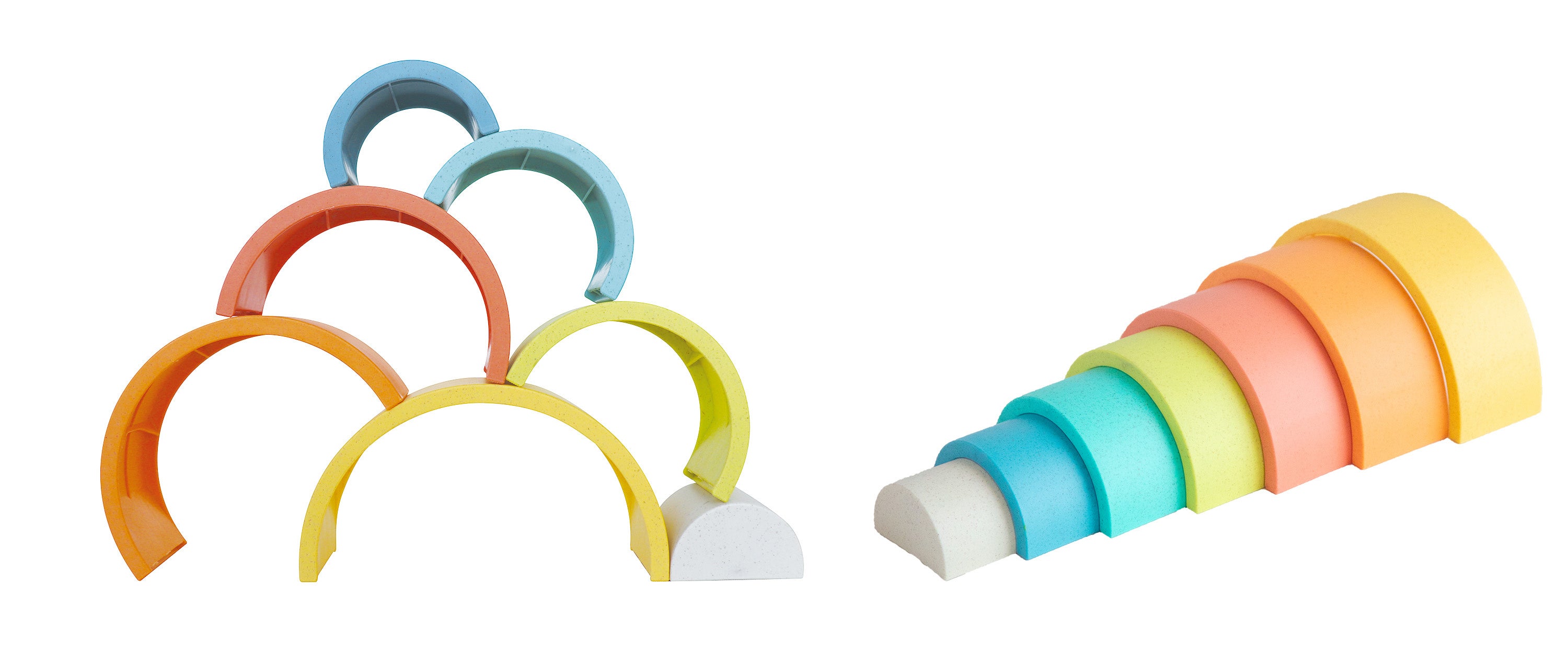 見た目も可愛いレインボーモチーフのスタッキングトイ。トンネルのように並べて見立てあそびや、バランス感覚を要する難しい積み方も出来ます。そのまま飾っておしゃれなところも嬉しいポイント。