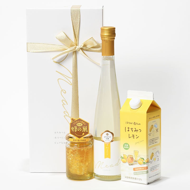こだわりの国産純粋はちみつ・はちみつレモンドリンク・自社醸造のはちみつ酒【ミード】のセットです。