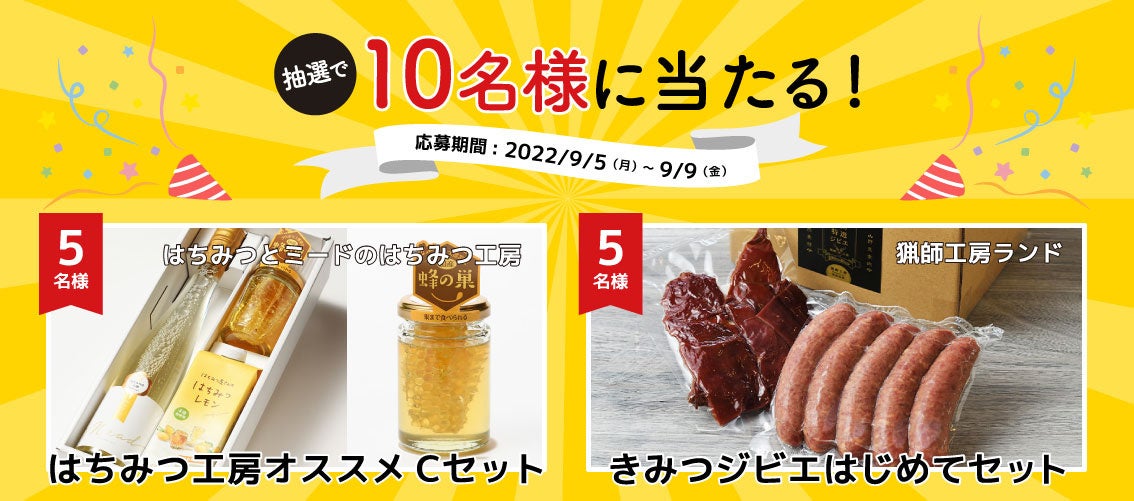 千葉県の産業復興を支援するモール型ECサイト「ありがとねっと」を運営する株式会社ジェス(本社:千葉県成田市 代表取締役社長:長谷川 直行)は、千葉テレビ放送株式会社(本社:千葉県千葉市 代表取締役社長:篠塚 泉)の『ちば朝ライブ・モーニングこんぱす』(毎週月曜~金曜 朝6:45~8:00) ~今週のプレゼント~ にて、2022年9月5日(月)~9月9日(金)までの期間にご応募いただいた方の中から抽選で、ありがとねっとに出店中のはちみつとミードのはちみつ工房様の「はちみつ工房オススメCセット」と、猟師工房ランド様の「きみつジビエはじめてセット」を各5名様、合計10名様にプレゼントいたします。