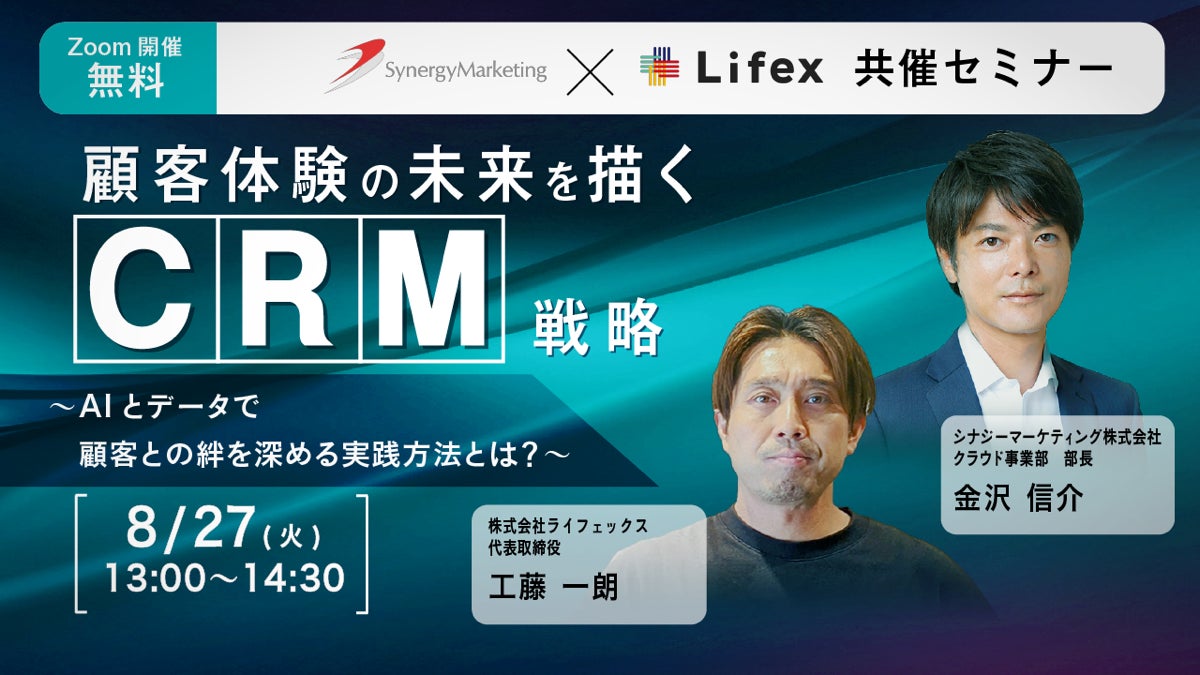 新規獲得からファン化までをトータルで支援するマーケティングプロデュースカンパニー、株式会社ライフェックス(所在地:東京都港区、代表取締役:工藤一朗 以下ライフェックス)は、生活者と企業のより良い関係づくりのために、一歩先のデジタルマーケティング体験を提案するパートナー、シナジーマーケティング株式会社(所在地:大阪市北区、代表取締役社長 兼 CEO:奥平 博史、以下:シナジーマーケティング社)と2024年7月22日に業務提携基本合意書を締結しました。両社のCRMに関する豊富な実績と知見を融合し、質の高いサービスを提供するため、7月31日から、ライフェックスのCRM担当者養成講座「みんなのCRMアカデミー」を、より一層実践的な「みんなのCRMアカデミーPlus(読み方:プラス)」として共同運営を開始します。