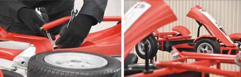 重さ約30Kg、部品点数約50種からなるペダルカートを使い、実際の生産ラインの様な環境で効率的な作業設計の方法を習得します。