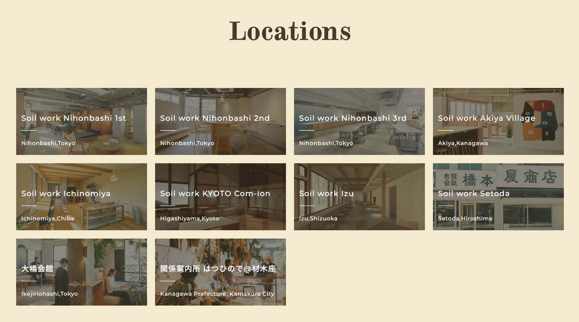 Soil workは「未来への『土仕事』」をキーワードに、経済的資本の成長だけではなく、文化的・自然環境的資本の最大化をもって社会をより良くしたいと願う人々のコーポラティブコミュニティです。日本橋などの都心拠点だけでなく、コミュニティメンバーが繋がるローカル(地方)やネイチャー拠点(海・山・川)へも展開し、「都心部からローカルやネイチャーへ」「ローカルからローカルへ」ヒトやアイデアの交換を促進します。現在、全国10拠点にてサービスを提供しています。