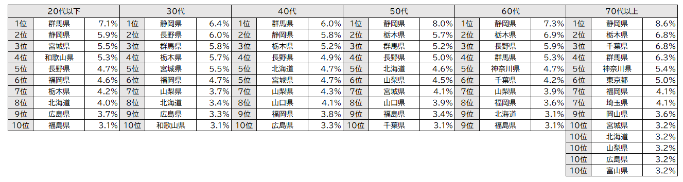 1位:静岡県、 2位:群馬県、 3位:栃木県