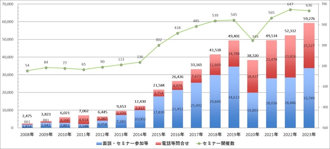 2023年の移住相談件数(面談・電話・メール・見学・セミナー参加)は、59,276件だった。2022年(52,312件)に対し13.3%増となり、3年続けて過去最多となった。また、移住相談会・セミナー等の開催数は、前年比で約1.7%減の636回。セミナーの開催方法は、オンラインが271回(43%)、ミックス(オンライン+対面)が167回(26%)、対面が198回(31%)だった。2022年の割合は、オンライン61%、ミックス19%、対面20%であり、比較するとオンラインでの開催から会場利用を伴うセミナーへの回帰が進んだ。