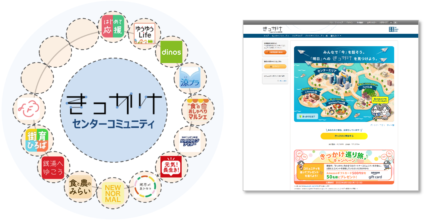 「きっかけ」(https://www.beach.jp/community/KIKKAKE/)は、産経新聞社とクオンが、共同で運営しているオンライン上のコミュニティです。ショッピングモールのようなイメージで発展していくのが特徴の1つで、「きっかけ」は、中心(センター)にある広場のような役目を果たしています。ユーザーはセンターコミュニティである「きっかけ」で、さまざまな会話やキャンペーンを楽しみながら、テナントにあたるクライアントの“パートナーコミュニティ“にも自由に参加、回遊し、コミュニケーションが活性化しています。