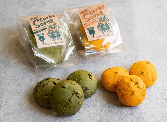 商品には、神戸ストークスの選手やバスケットボールゲームを応援するファンの皆さまが、“健康を意識しながら、手軽に食べられる”をコンセプトに、オイシスの得意とするスイーツジャンルや焼菓子製造のノウハウを用いて、若年層にも人気のあるスコーンを使って企画。開発段階では、神戸ストークスの渡邊翔太選手にも試食いただき、アスリート視点でのアドバイスをもらいながら、神戸ストークスらしさやバスケットボールを想起するものとして、スコーンをボール状にするなど、さまざまな試作と検証を実施。神戸ストークスのチームカラーであるストークスグリーンをイメージした「緑茶&ナッツ」とバスケットボールをイメージした「キャロット&パンプキン」の2種類のスコーンを開発しました。