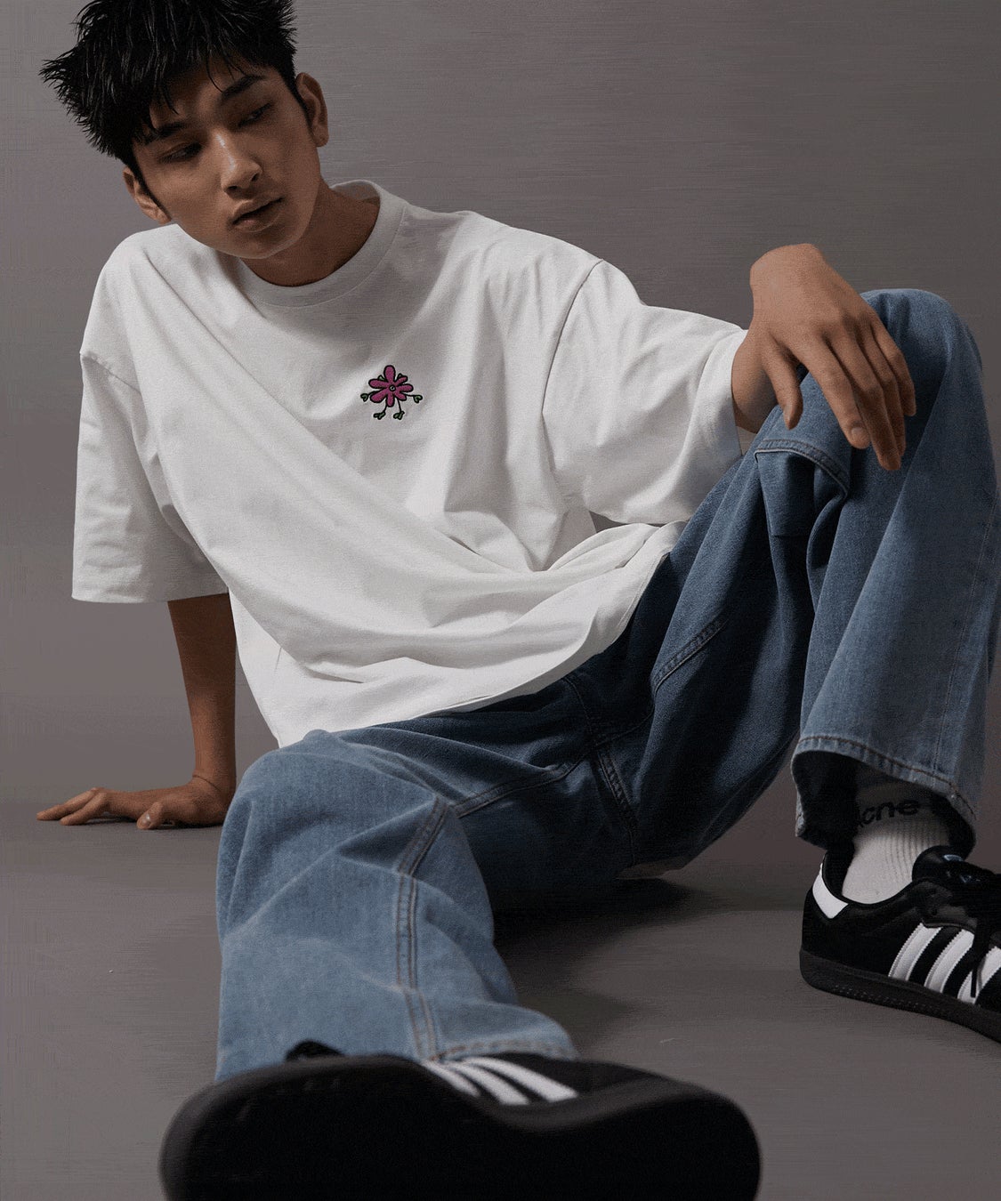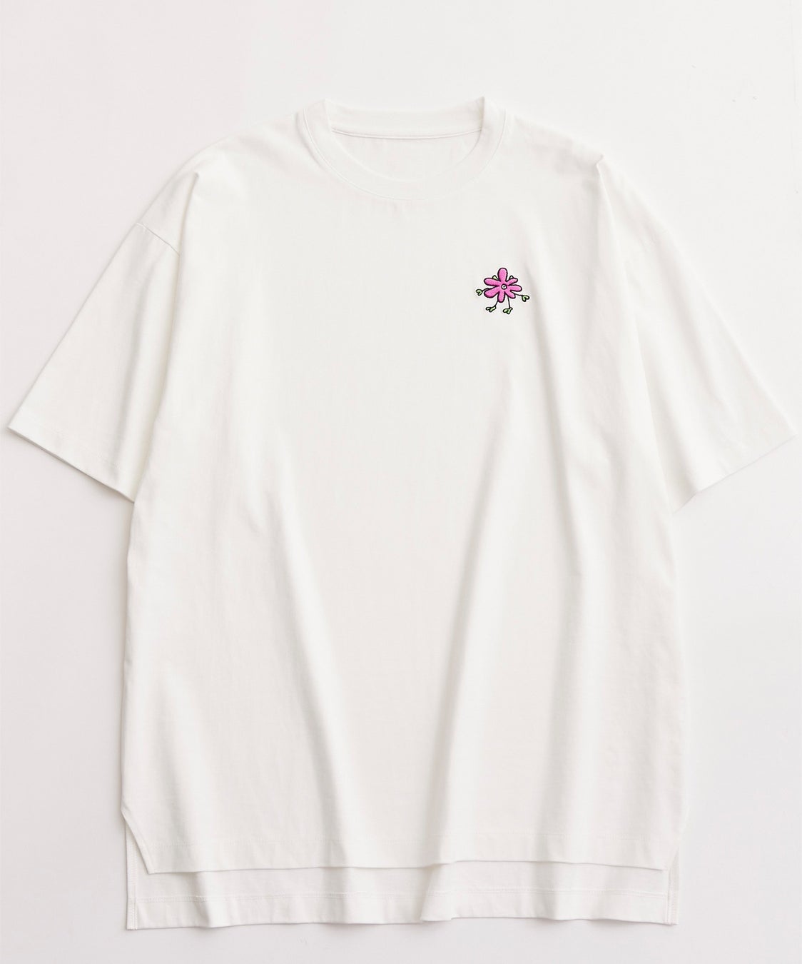 ワンポイントでカラーのお花妖怪の刺繍を取り入れた、シンプルながらも個性が光るTシャツ。