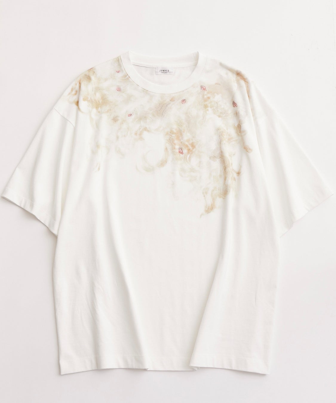 プリントデザインのモチーフは、スキャンした羊毛を水彩画のタッチで描いて頂いたもので、私らしさとJUNRedらしさをバランスよく表現。