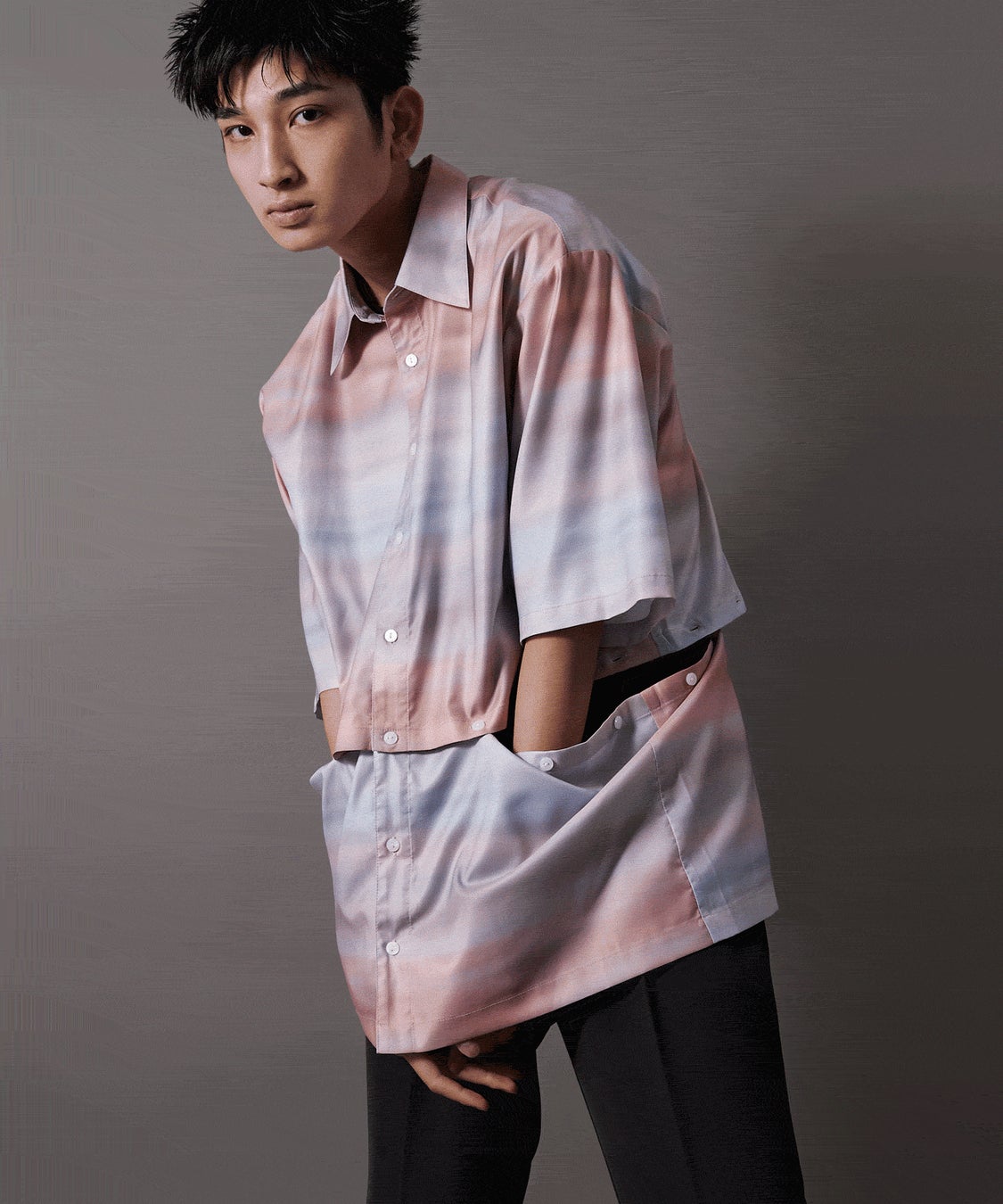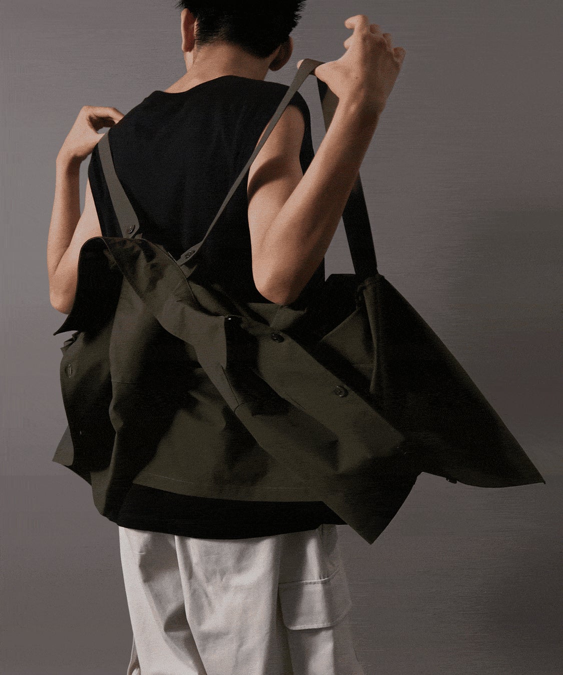 一見シンプルなシャツが、2種類のショルダーバッグへ、ベルトを肩にかけ背負えるシャツへと変化するデザイン。