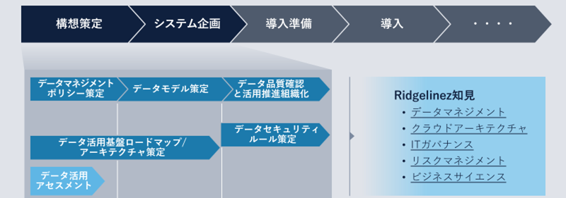 Ridgelinezでは、「データ仮想化」導入支援に際し、構想策定からシステム企画、導入準備から実行、導入後の支援まで様々なコンサルティングサービスを提供しています。データマネジメント、クラウドアーキテクチャ、ITガバナンス、リスクマネジメント、ビジネスサイエンスなど幅広いIT分野に知見を持つコンサルタントが、クライアントの課題解決に向けた様々な施策提案を行っています。
