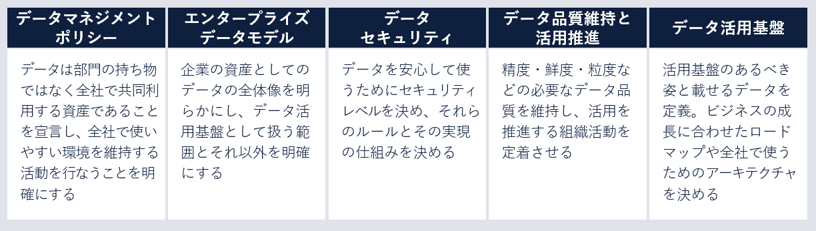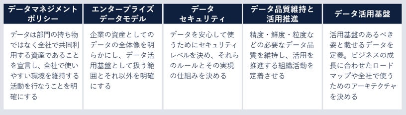 ・データマネジメントとは、データをビジネスに活かすことのできる状態を継続的に維持・進化させていくための「組織的な営み」です。