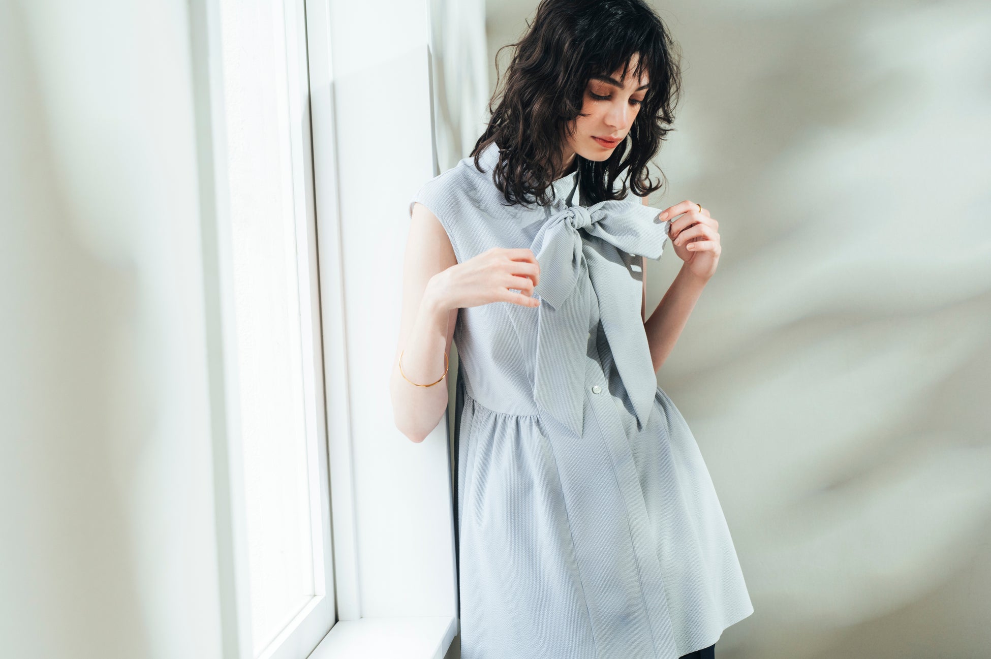 ニットだからこその立体的なシルエットは、体型をカバーしながらもフィット&フレアの凛とした美しさを演出。襟元のリボンは結んでも垂らしてもバランス◎。