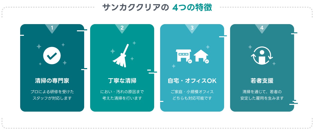 「サンカククリア」では、清掃を頼むことで単純に家がきれいになるだけでなく、若者たちの仕事の応援につながります。今後は事業の立ち上げにとどまらず、企業と協働して若者に向けた清掃の職業訓練づくりに取り組んでまいります。