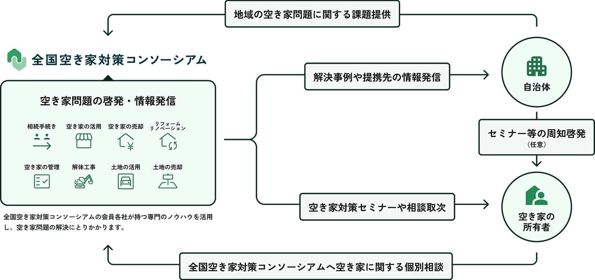 手放したくても何をしたら良いか分からない、売りたいのに売れないという悩みを抱える不動産所有者への支援を強化し、コンソーシアムに参画している事業会社・学術団体とともに、空き家対策を推進してまいります。
