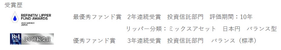 「リフィニティブ・リッパー・ファンド・アワード」は毎年、多くのファンドのリスク調整後リターンを比較し、評価期間中のパフォーマンスが一貫して優れているファンドと運用会社を表彰いたします。選定に際しては、「Lipper Leader Rating (リッパー・リーダー・レーティング)システム」の中の「コンシスタント・リターン(収益一貫性)」を用い、評価期間3年、5年、10年でリスク調整後のパフォーマンスを測定いたします。評価対象となる分類ごとに、コンシスタント・リターンが最も高いファンドにリフィニティブ・リッパー・ファンド・アワードが贈られます。詳しい情報は、lipperfundawards.comをご覧ください。Refinitiv Lipperは、本資料に含まれるデータの正確性・信頼性を確保するよう合理的努力をしていますが、それらの正確性については保証しません。