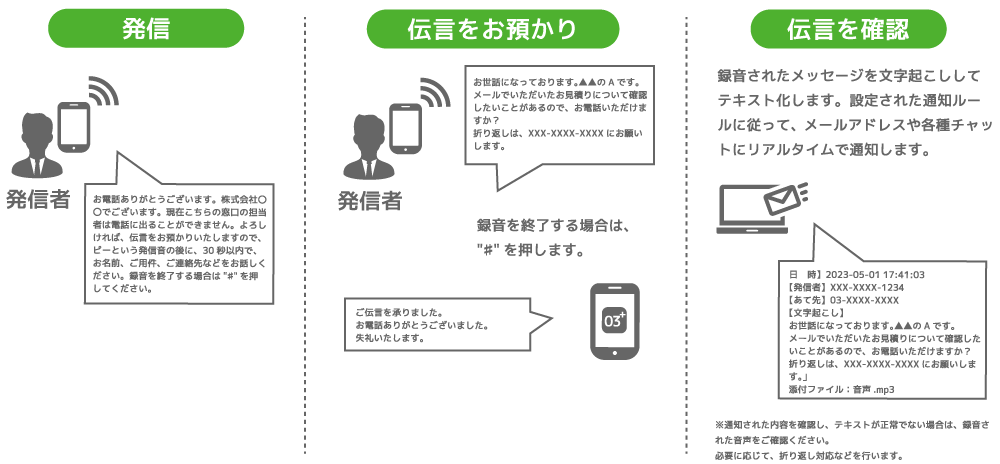 かかってきた電話に自動音声で対応し、用件を録音するように促します。録音されたメッセージはテキストに変換され、その内容は各種チャットに通知されます。