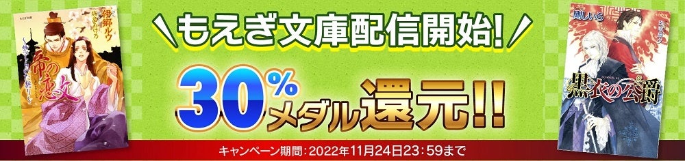 配信開始に伴い、もえぎ文庫全作品30%メダル還元率UPキャンペーンを開催いたします。
