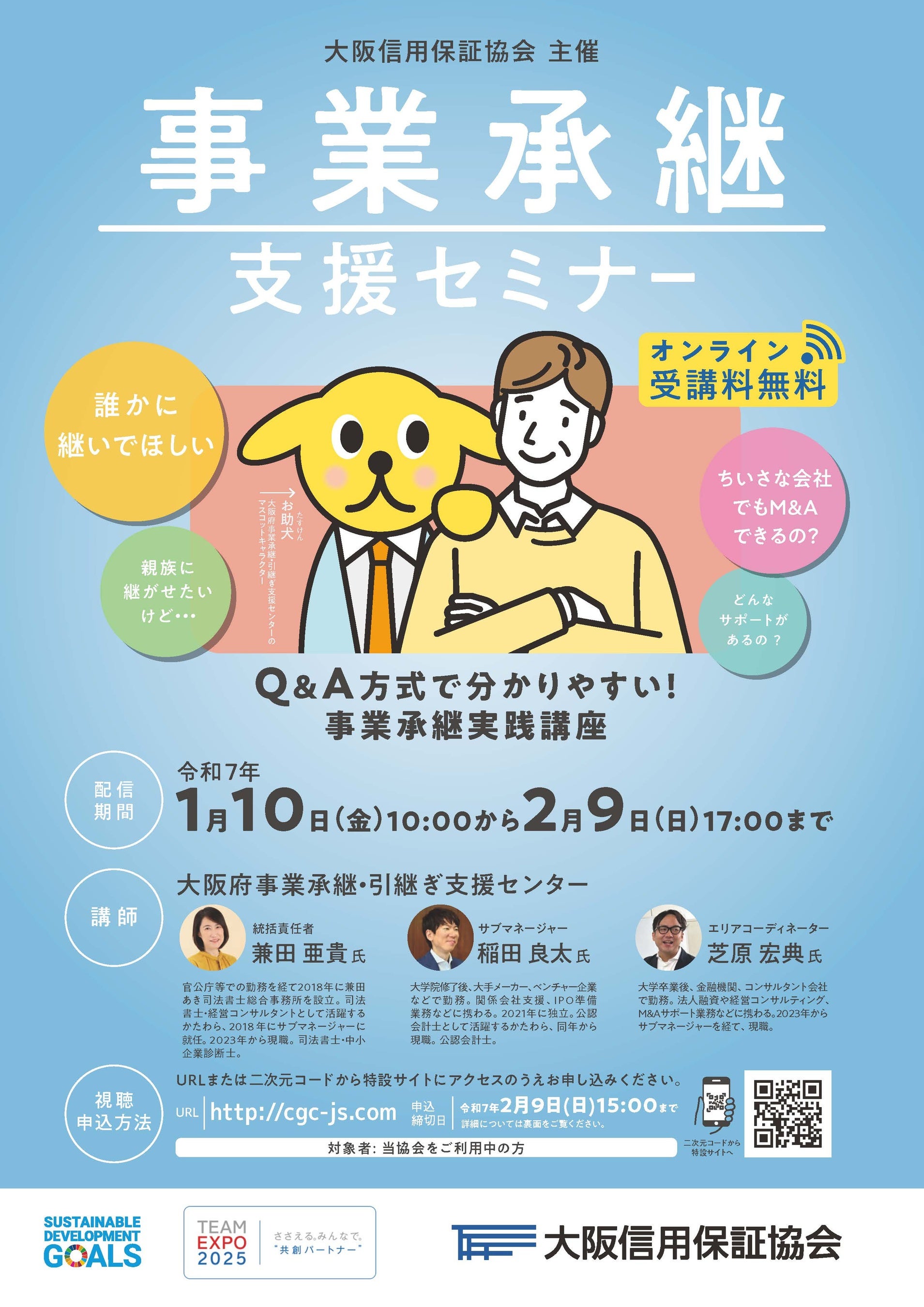 大阪信用保証協会(理事長 新井 純)は、当協会利用中の中小企業者を対象に事業承継支援の取組みの一環として、「事業承継支援セミナー」を令和7年1月10日(金)~令和7年2月9日(日)までオンラインにて配信します。