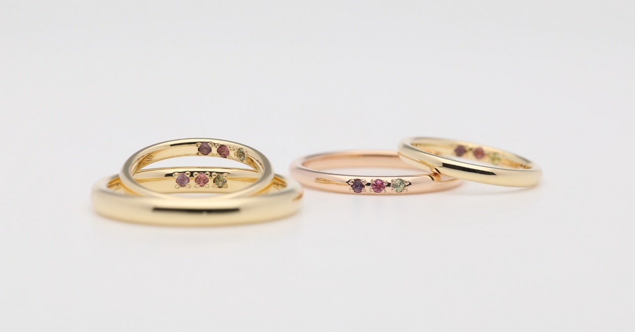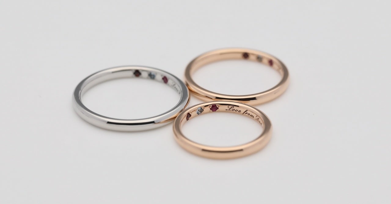 大切な人や家族の誕生石を身に着けることで、「相手の幸せを願い絆を深め守り続ける」という意味がこもります。最大4石までを指輪の外側・内側どちらかお選びいただきお留めしますので、家族の誕生石を1本のリングにセットすることで、お守りのように絆を深く感じる指輪として身に着けていただけます。