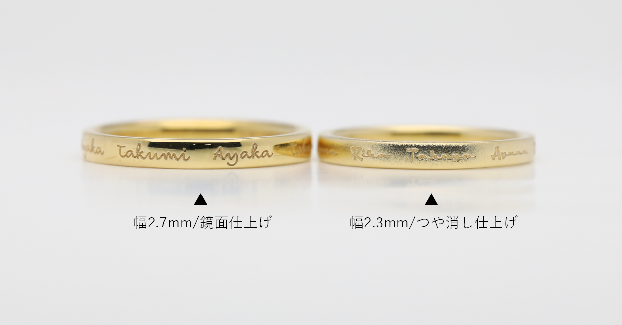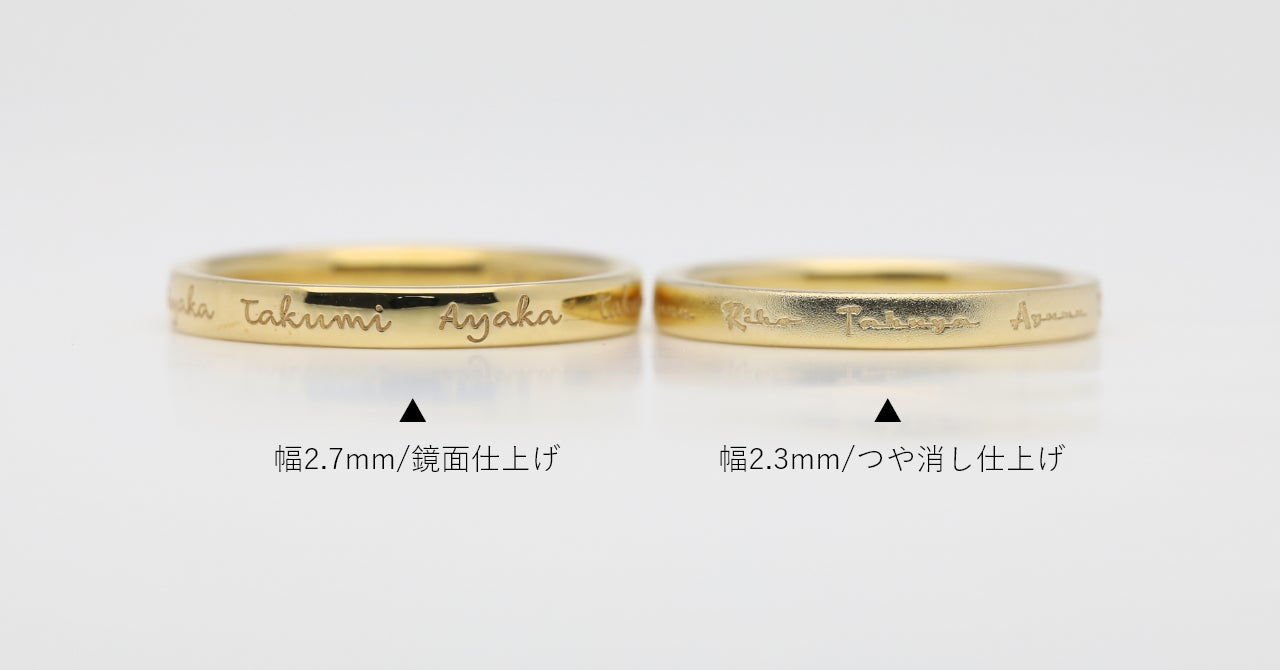 リング表面のテクスチャーは、鏡面仕上げとつや消し仕上げの2種類を。また幅も2.3mmと2.7mmの2種類をご用意いたしました。