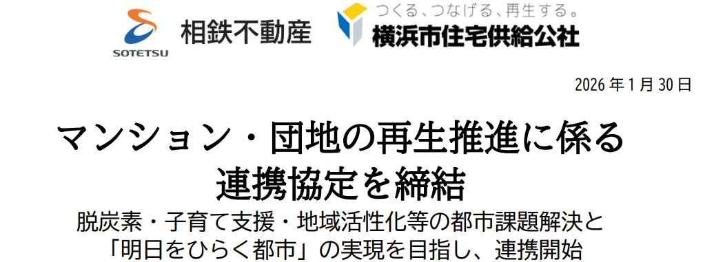 相鉄不動産㈱(本社:横浜市西区、代表取締役社長:平野 雅之、以下「相鉄」)と横浜市住宅供給公社(本社:横浜市神奈川区、理事長:小林 一美、以下「公社」)は、1月29日(木)横浜市内に所在するマンションおよび住宅団地の再生推進を目的とした包括連携協定(以下「本協定」)を締結しました。