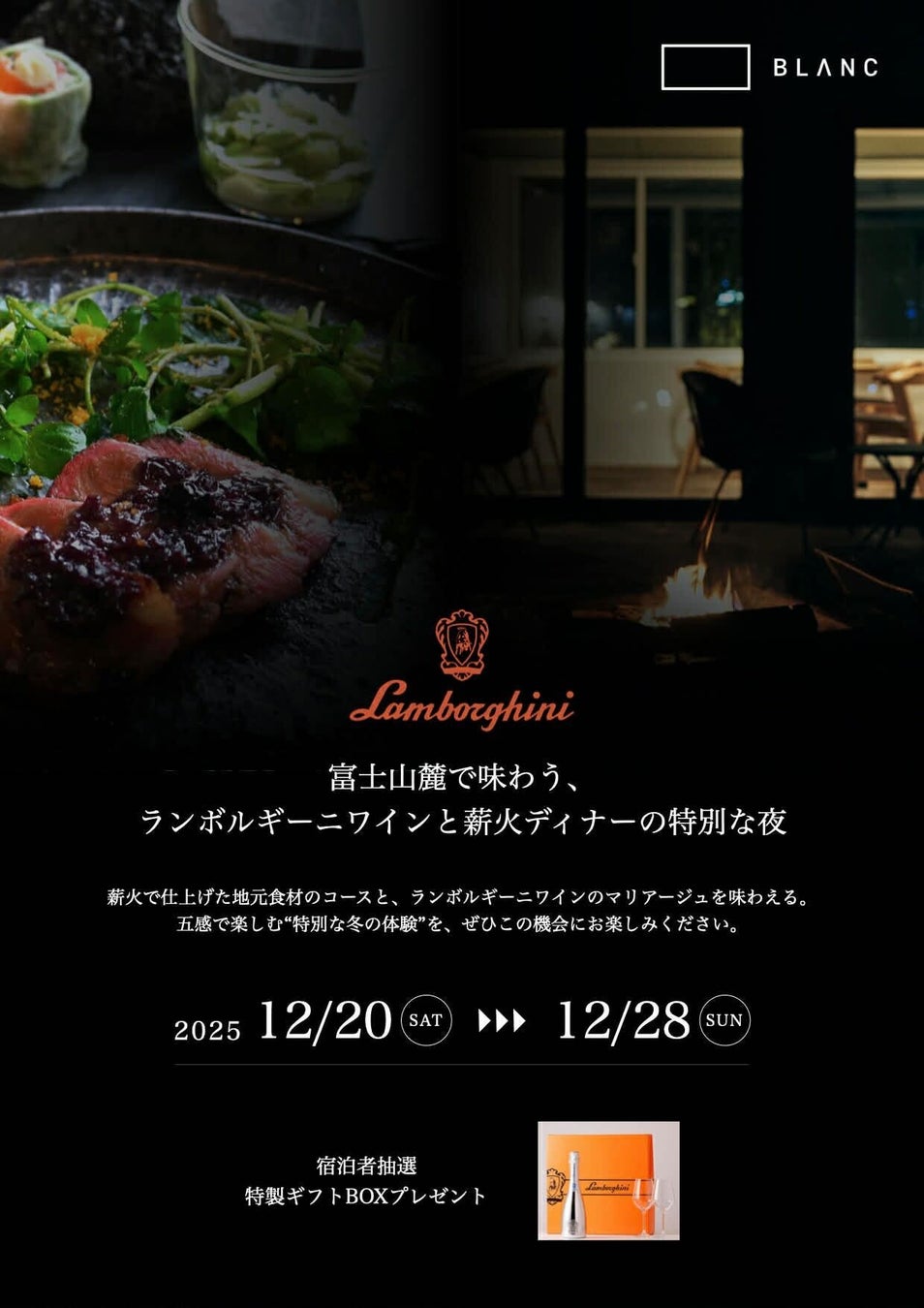 自然共生型ホテル「BLANC FUJI」を運営する株式会社BLANC(本社:東京都港区、代表取締役:山中 拓也、以下「当社」)は、イタリアの名門ワインブランド「Tenuta Lamborghini」の日本総販売代理店であるMarcheJapan株式会社とのコラボレーションにより、冬季限定のペアリングディナーイベントを2025年12月20日〜28日、BLANC FUJIにて開催いたします。