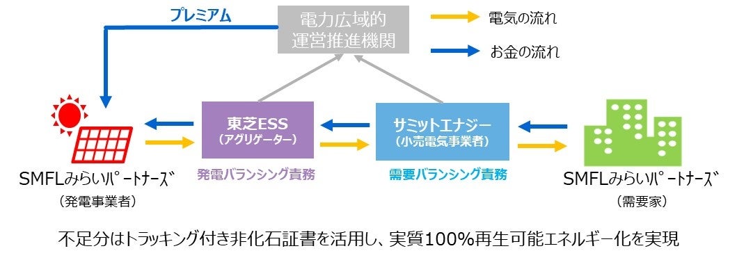 三井住友ファイナンス&リース株式会社(代表取締役社長:橘 正喜、以下「SMFL」)の戦略子会社、SMFLみらいパートナーズ株式会社(代表取締役社長:寺田 達朗、以下「SMFLみらいパートナーズ」)と、東芝エネルギーシステムズ株式会社(代表取締役社長:四柳 端、以下「東芝ESS」)、東芝ネクストクラフトベルケ株式会社(代表取締役社長:新貝 英己、以下「TNK」)、およびサミットエナジー株式会社(代表取締役社長:小林 政司、以下「サミットエナジー」)の4社は、需要家へ実質100%再生可能エネルギー由来の電力供給を行う目的で、FIP(Feed-in Premium)制度※1下の太陽光発電による電力を含む非化石証書付き電力を需要家に供給するスキームを構築し、協業拡大することに合意しました。