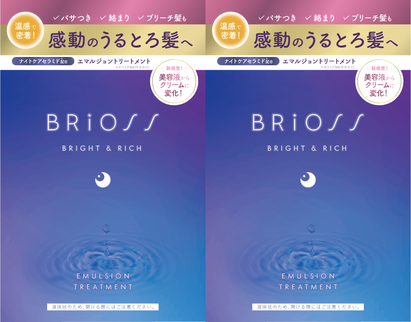 「ブリオス エマルジョントリートメント」は液体がクリームに変化する新感覚の洗い流すトリートメントです。髪と地肌に素早く浸透しやすいというウォータータイプのメリットはそのままに、水に反応してクリーム状に変化することで髪1本1本に栄養成分が密着し、ヘアカラーやブリーチなどのダメージが気になる方、パサつきや毛先の乾燥が気になる方、髪にツヤが欲しい方のお悩みをしっかりサポート。さらに、温感スチーム作用で栄養成分の浸透を促し、指通りの良い瞬間サラツヤな髪へと導きます。ズボラ女子にも嬉しい時短トリートメントで、忙しい毎日でも楽して10秒簡単キレイ髪に。