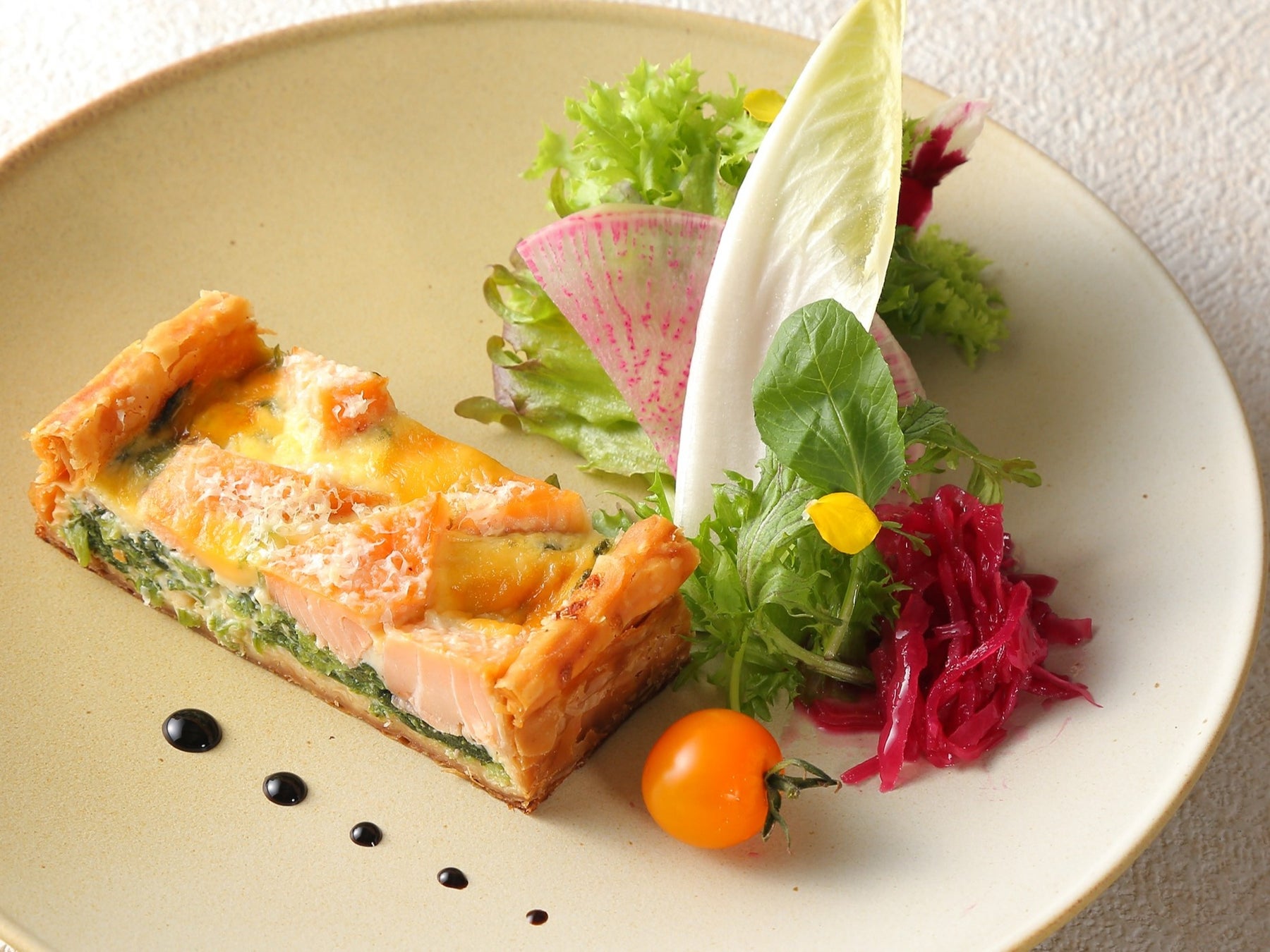 『サーモンとほうれん草のキッシュ 彩り野菜のサラダ仕立て』(スープ付き)