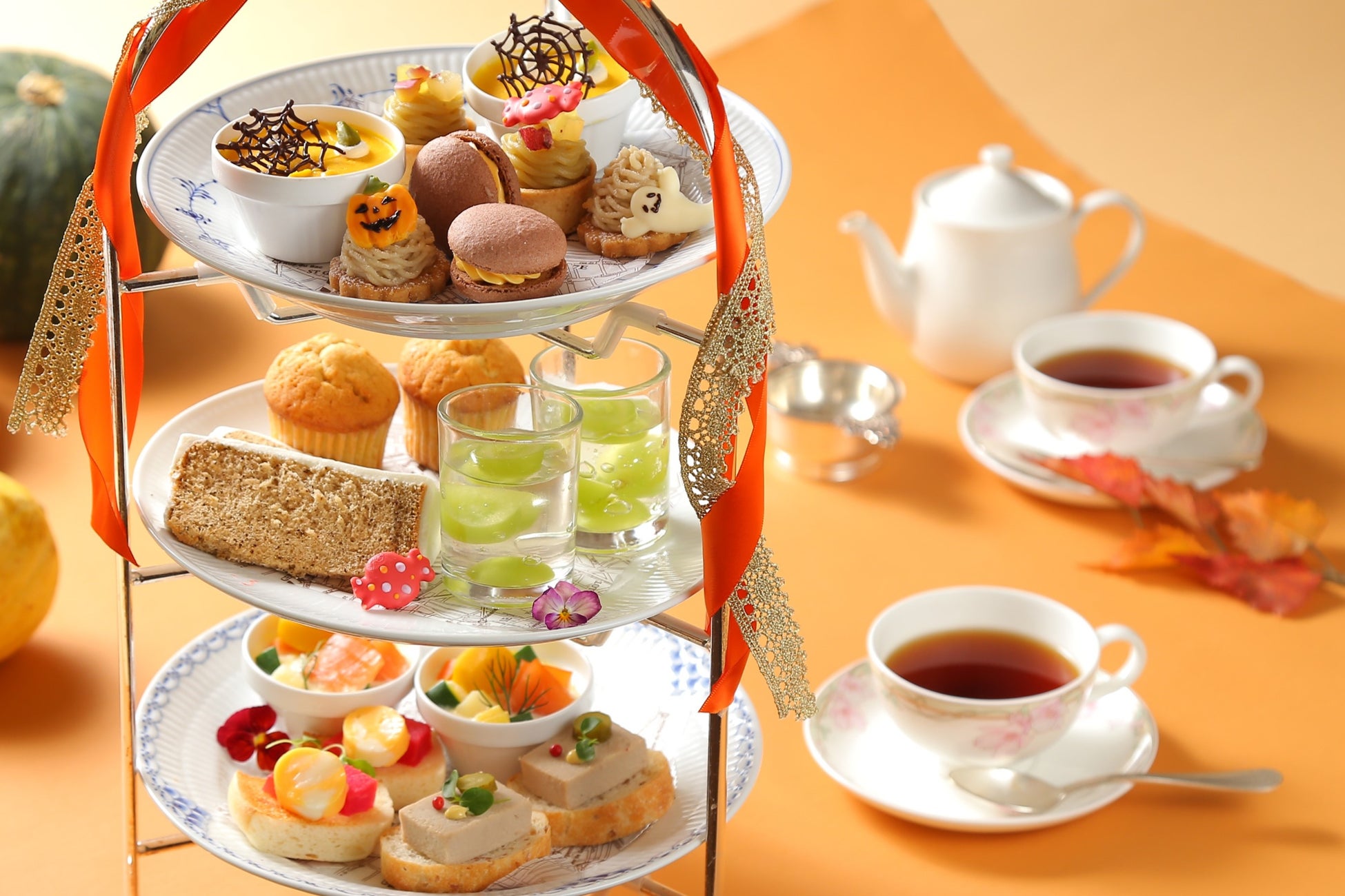 9月・11月にホテルラウンジで提供するアフタヌーンティーの三段スタンドには、紫芋タルト、マロンサブレ、かぼちゃプリンといった秋の味覚を堪能できるスイーツのほか、ゴロッとした具材の食感も楽しめるクラムチャウダーなど彩り鮮やかなセイボリーが並びます。10月中は一部メニューをハロウィン仕様にアレンジし、秋のユニークイベントを甘く可愛らしく演出します。予約不要で1名利用から注文可能のため、本格的なアフタヌーンティーを気軽に楽しむことができます。