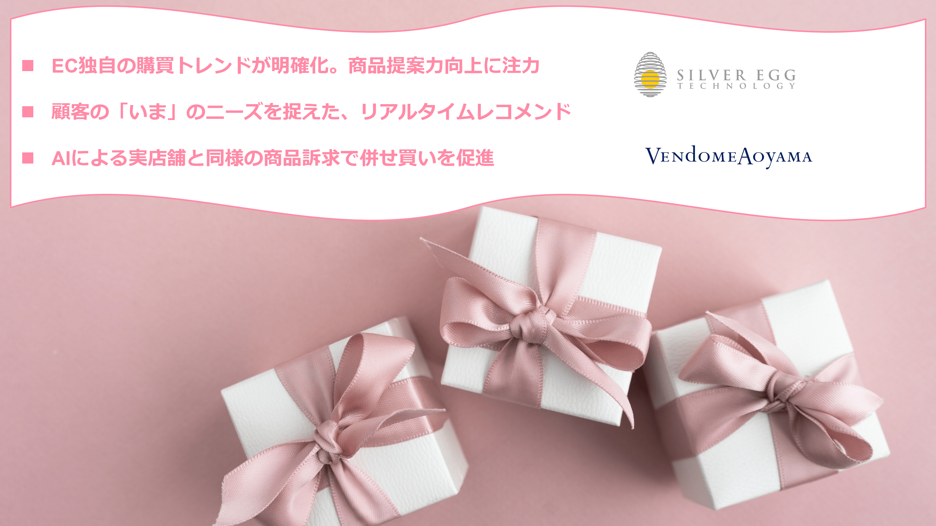 シルバーエッグ・テクノロジー株式会社(本社:大阪府吹田市、代表取締役社長&CEO:トーマス・フォーリー、証券コード 3961、以下 シルバーエッグ)は、同社が開発・提供するAI技術を用いたリアルタイム・レコメンドサービス「アイジェント・レコメンダー」を、アクセサリーの企画・販売、輸入等を行う株式会社ヴァンドーム ヤマダ(本社:東京都港区、代表取締役社長:山田 潤、以下 ヴァンドーム ヤマダ)の公式ECサイト“VENDOME JEWELRY ONLINE STORE”(https://vendome.jp/)に導入したことを発表します。