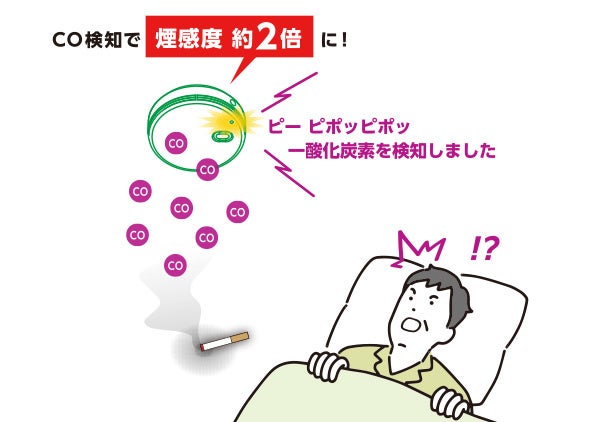 COを検知すると、約2倍の煙感度に切り替わります。