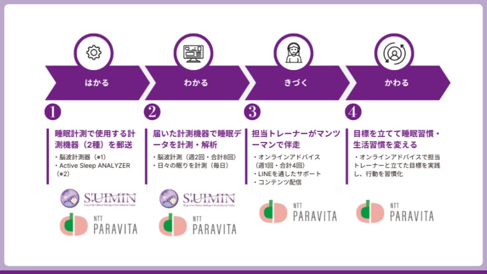 SOMNO+は、睡眠脳波を高精度に測定できるS'UIMINの計測技術と一人ひとりの課題に応じて睡眠習慣を改善に導くNTT PARAVITAの睡眠改善メソッドの掛け合わせによって、睡眠に悩む利用者の眠る力を引き出し、ぐっすりと眠れる毎日へと導きます。