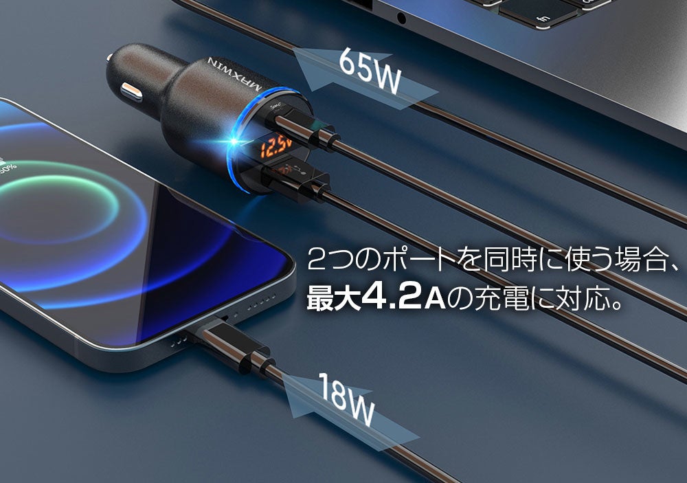 2つのポートを同時に使う場合は、最大4.2Aの充電に対応します。