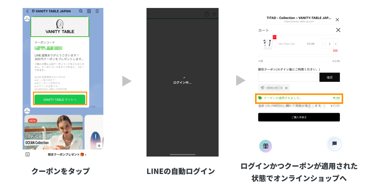 クーポンを受け取ったお客様は、メッセージをタップするとLINEログインした状態でECサイトに遷移しクーポンが自動的に適用されるため、そのままお得にお買い物ができます。