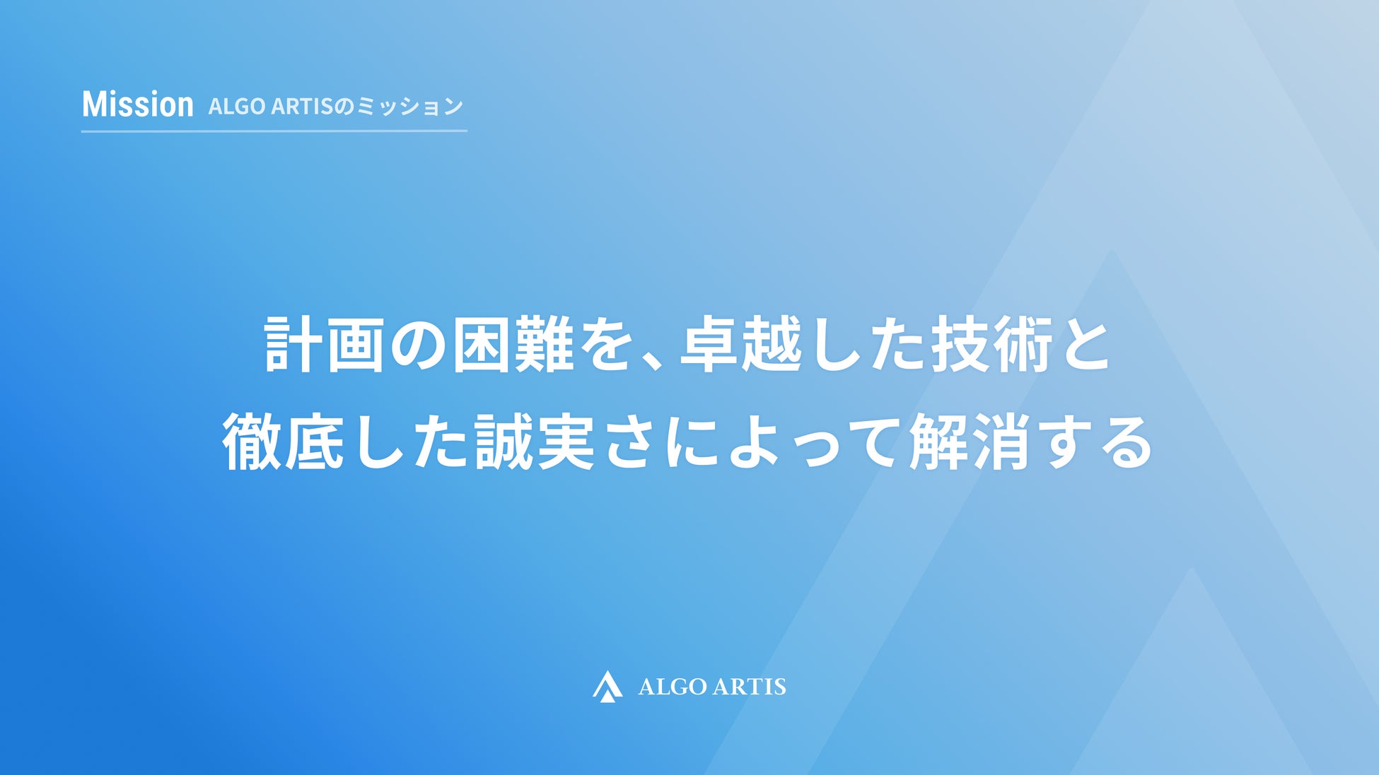 計画はあらゆる社会活動に必要で、その良し悪しは生産性やリスクを大きく左右する極めて重要な概念です。一方で計画は原理的に非常に複雑な問題になることが多く、人間の能力では十分に効率的な計画を作成することは困難です。この困難を解消するために、ALGO ARTISは常に卓越した技術を備える技術者集団であり続けます。しかしそれだけではなく、その卓越した技術をどのように活かし、プロダクトを開発し、サービスを提供するのかを、常にお客様や社会のために誠実に考え尽くし、体現しなければなりません。自社の成長だけではなく、お客様との共存共栄と社会への貢献こそが真の課題解消であると信じています。
