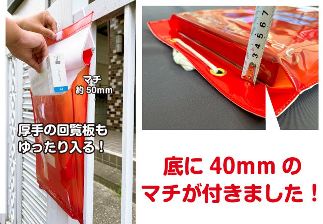 回覧板は地域によって種類が異なります。特に厚手の回覧板は収納が窮屈になることがありました。そこで、底部分に40mmのマチを追加し、ゆったりとした空間を作りました。