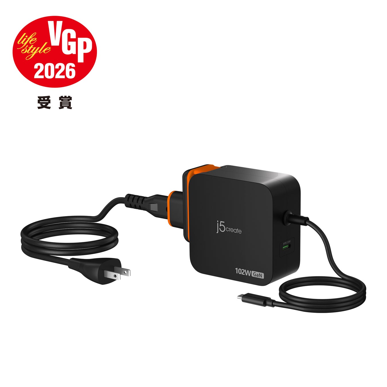 「VGP 2026」受賞。スマートフォン・PC関連アクセサリー(充電関連)/ 102W USB-C 2ポートPort GaN充電器 AC 延長キット 『JUP25100P』